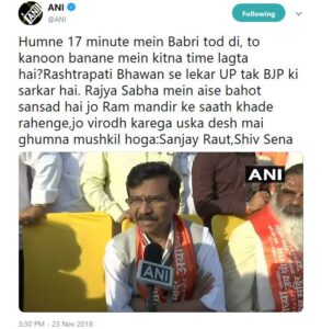 शिवसेना के सांसद संजय राउत ने कहा कि हमने 17 मिनट में बाबरी तोड़ दी, तो कानून बनाने में कितना टाइम लगता है? राष्ट्रपति राजभवन से लेकर यूपी तक बीजेपी की सरकार है। राज्यसभा में ऐसे बहुत सांसद हैं जो राम मंदिर के साथ खड़े रहेंगे, जो विरोध करेगा उसका देश में घूमना मुश्किल होगा। संजय राउत के इस कमेंट के सोशल मीडिया में आने के बाद ट्विटर पर @singhjitesh11 ने लिखा कि मोदी सरकार को अब राम मंदिर निर्माण के लिए जल्द कानून बनाना चाहिए। अगर सुप्रीम कोर्ट के निर्णय से होगा तो फिर SC/ST पर भी मानना चाहिए था। रामलला टाट मे और मोदी सरकार ठाठ मे। मंदिर निर्माण जल्द करें।