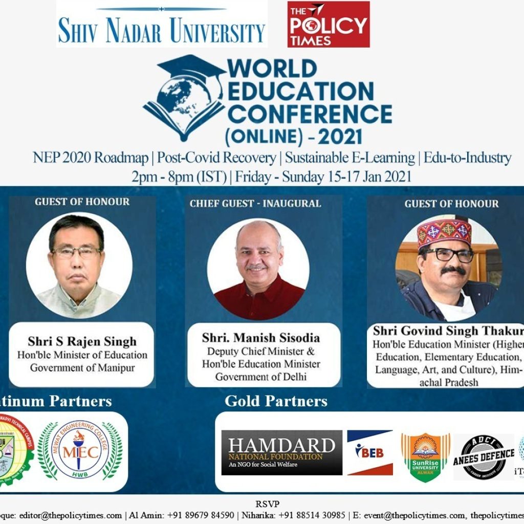 To deliberate on such issues, The Policy Times and Shiv Nadar University are jointly organizing a 3-Days virtual conference – the World Education Conference (WEC2021 online) between Friday, 15 January 2021and Sunday, 17 January 2021 from 2pm-8pm(IST) on Zoom. WEC2021 aims to bring the world’s educators ona single platform and discuss a new direction to education in 2021. The Conference will feature discussionson the Post-Covid recovery roadmap of education losses occurred in 2020, NEP 2020 implementation roadmap, Sustainable E-learning, and most importantly, education-industry integration.